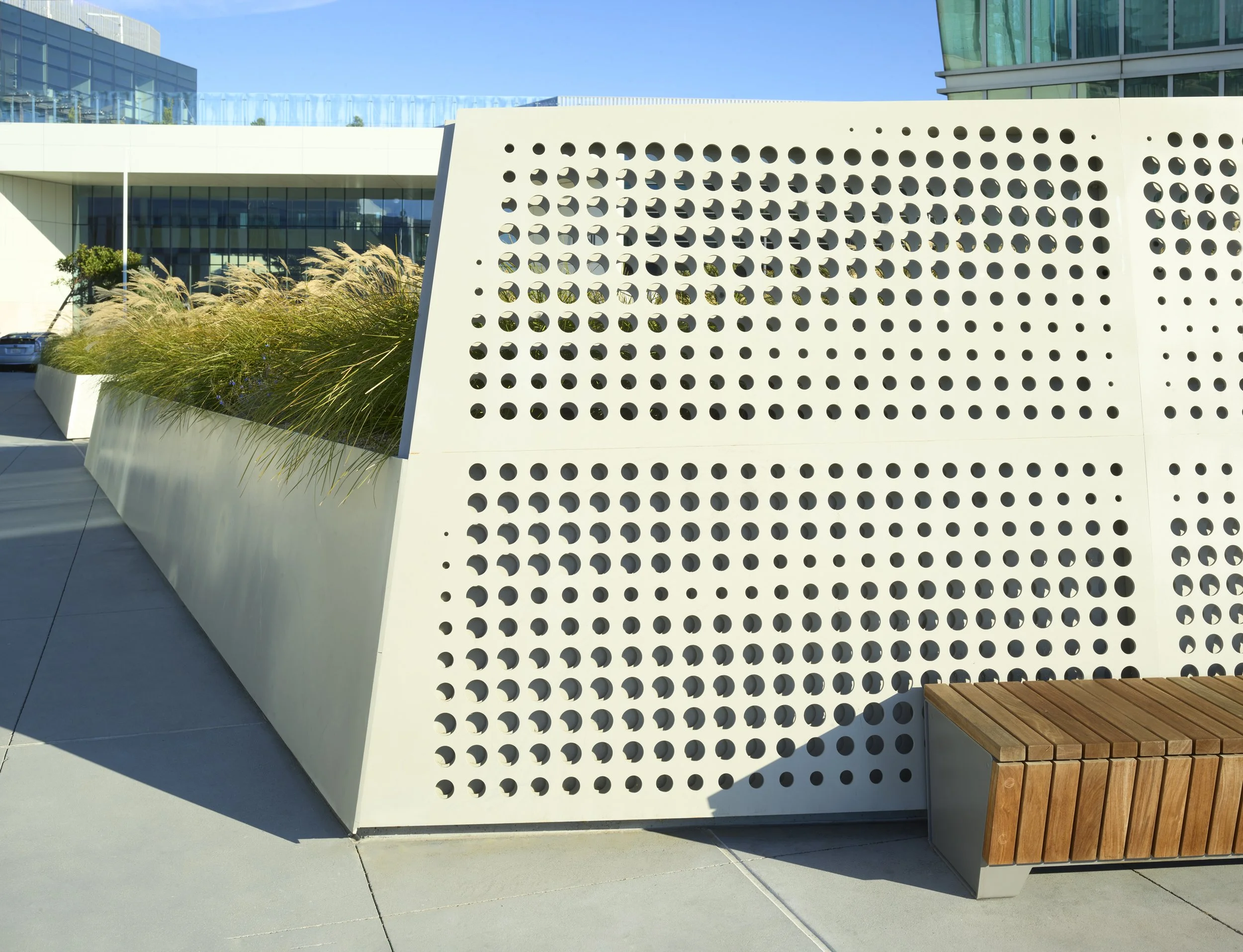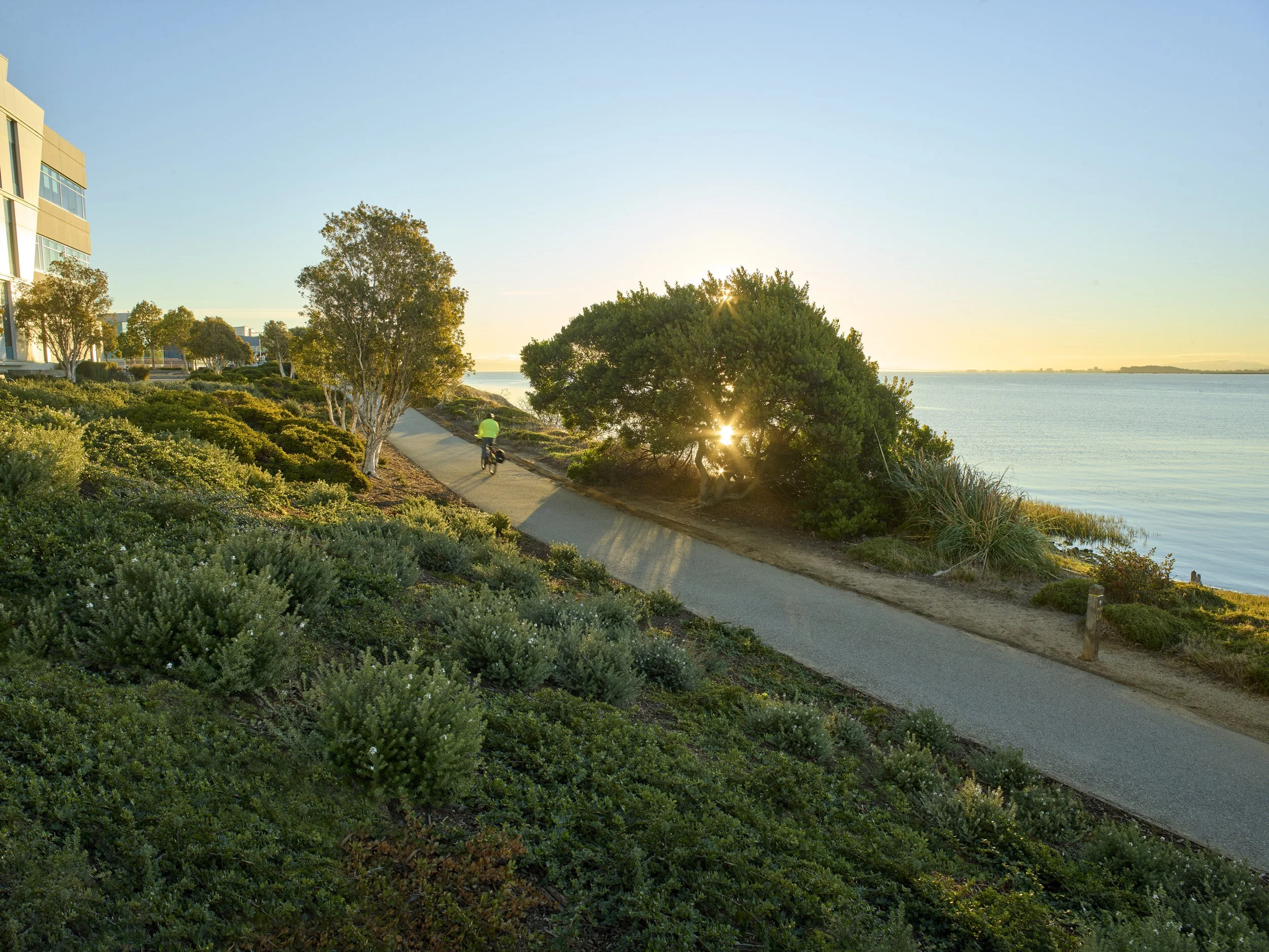 The custom, parametrically designed screen at the southern terminus of the planters was strategically formed, perforated, and located in collaboration with CPP’s wind engineers. The screen successfully diffuses the strong winds, offering pockets of shelter for people to enjoy this south facing plaza year-round. The landscape terraces down to the Bay Trail with a sequence of gathering areas and amphitheater seating. Native plants create a naturalized edge creating habitat for the birds who reside on the mudflats, and aligns with the region’s larger ecological restoration goals.