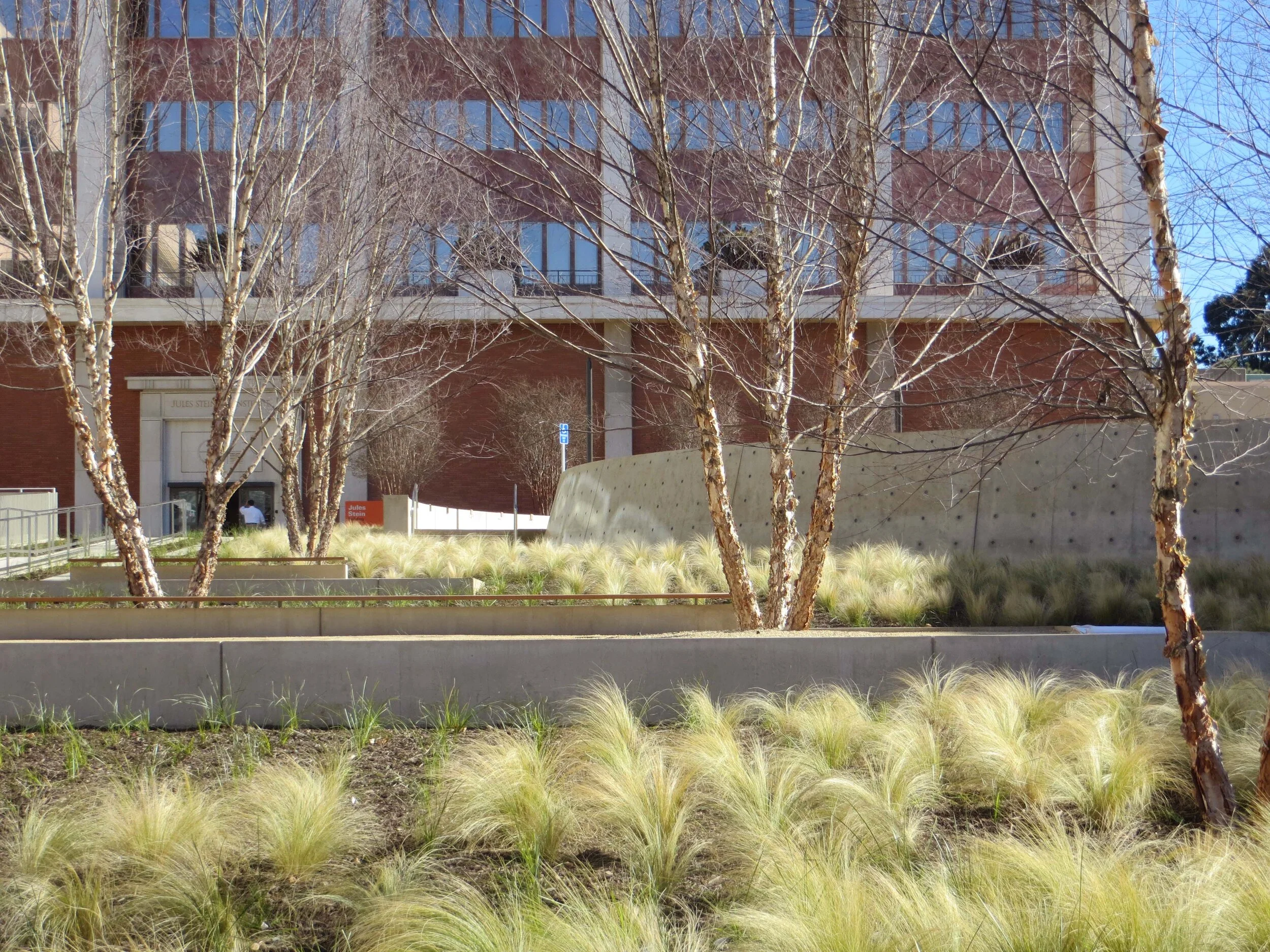 The Edie and Lew Wasserman Building at UCLA Medical School, designed by Richard Meier and Partners transformed the Jules Stein Eye Institute. Countering the strong architectural frame, the landscape inserts a striking meadow with sculptural birch trees that offer respite to the intensity of hospital and lab work.